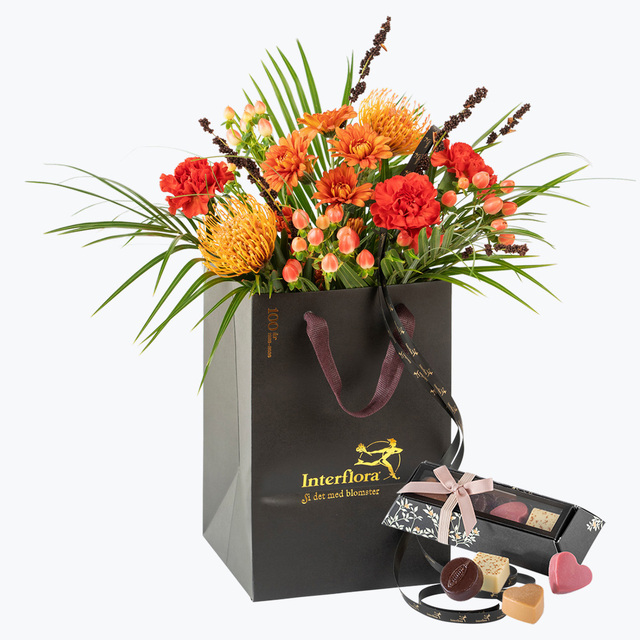 Herlig fargesterk bukett satt sammen av blomster i høstens varme gylne farger. Buketten leveres sammen med en eske 4 stk deilige konfektbiter.